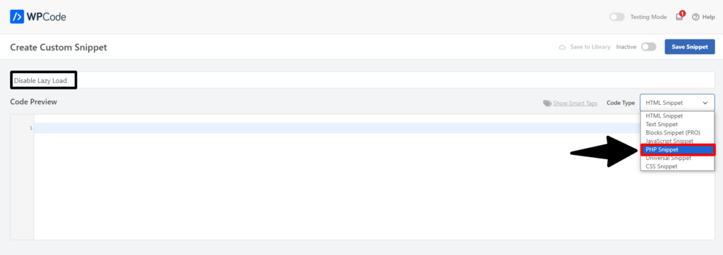 Next, choose ‘PHP Snippet‘ from the ‘Code Type‘ dropdown menu in the right corner of the screen.