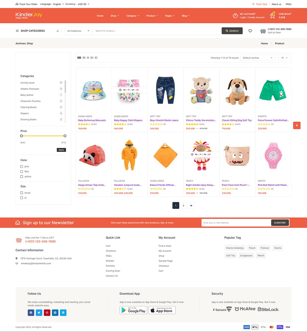 In summary, KinderJoy is a meticulously crafted WooCommerce theme tailored for kids’ fashion and toy stores. With its flexible design options, versatile catalog layouts, customizable page compositions, and integration of static content, KinderJoy empowers you to create an exceptional online shopping escapade that captures the very essence of childhood wonder. Elevate your business with KinderJoy’s unrivaled features and customizable functionalities, leaving an indelible mark on both young trendsetters and their discerning parents.